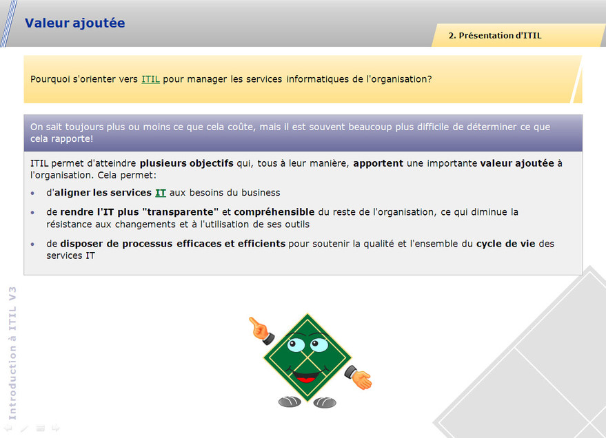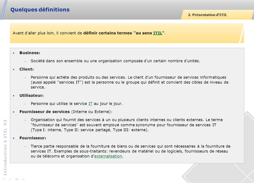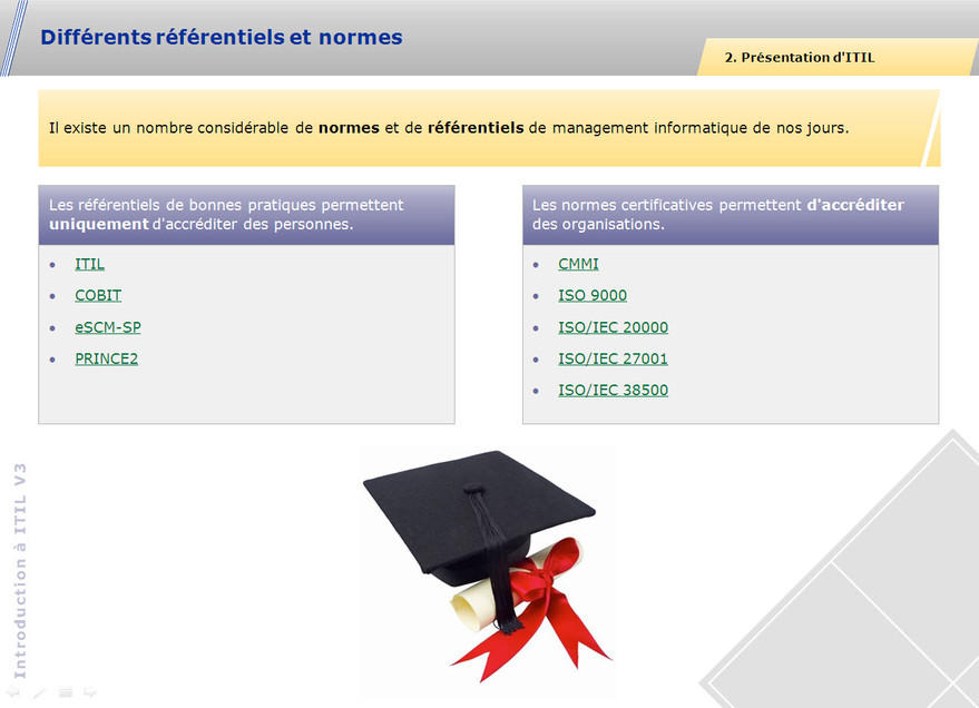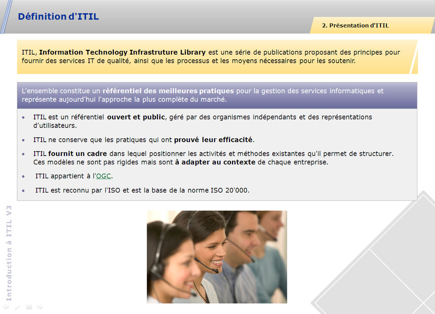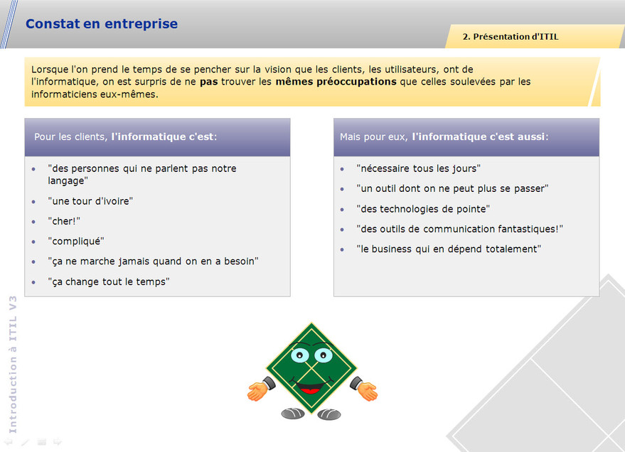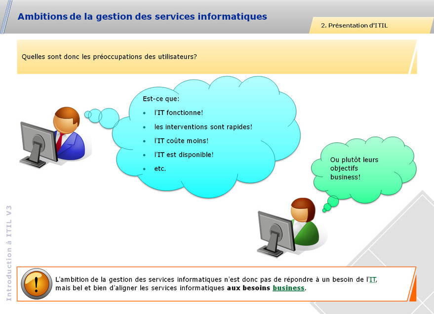 Acteurs impliqués dans la gestion des services IT, devant comprendre le cadre ITIL et son utilité pour améliorer la qualité de la gestion des services IT au sein d'une organisation. Ceci inclut les professionnels informatiques, les gestionnaires business et les propriétaires de processus business.