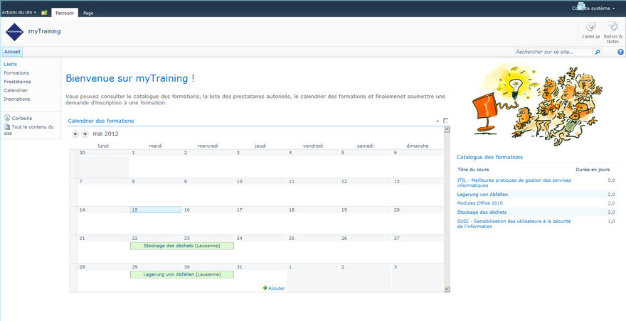 myTraining est une application développée sur Microsoft SharePoint 2010 qui vous permet de gérer les formations de vos collaborateurs, d’assurer un suivi des certifications obtenues et de planifier les prochaines formations en relation avec les objectifs du collaborateur.