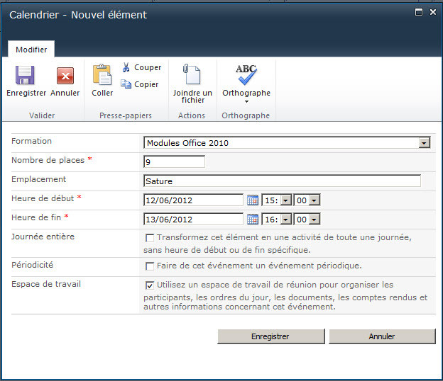 Lorsqu'une formation est planifiée, il est possible de commander directement un espace de travail pour cette formation. L'enseignant pourra y déposer ses documents de cours, ses travaux pratiques, y créer un sondage, etc.