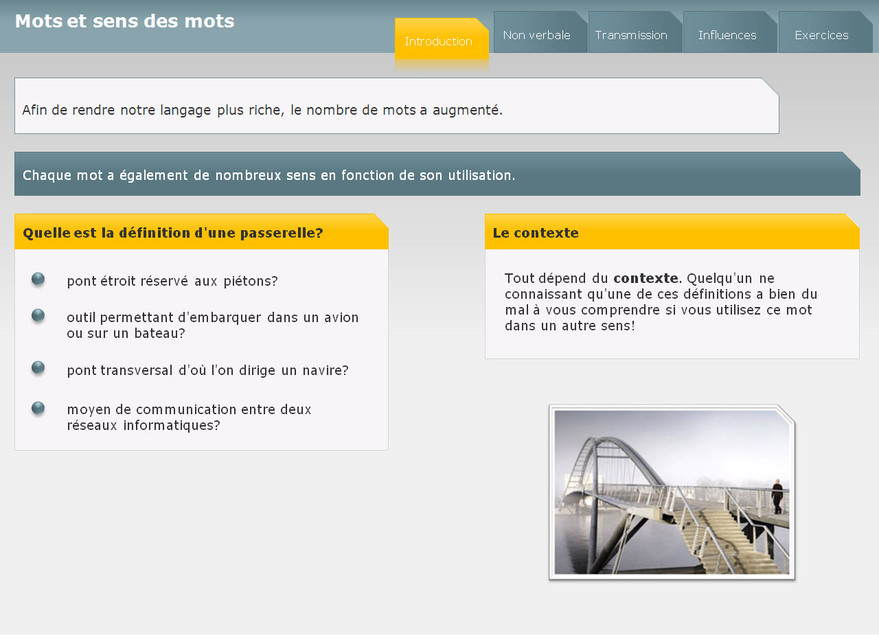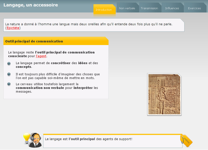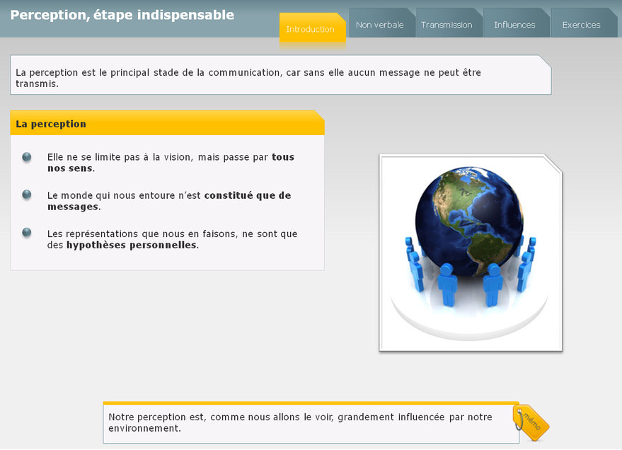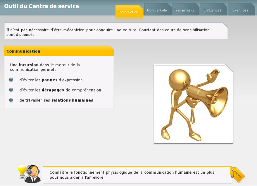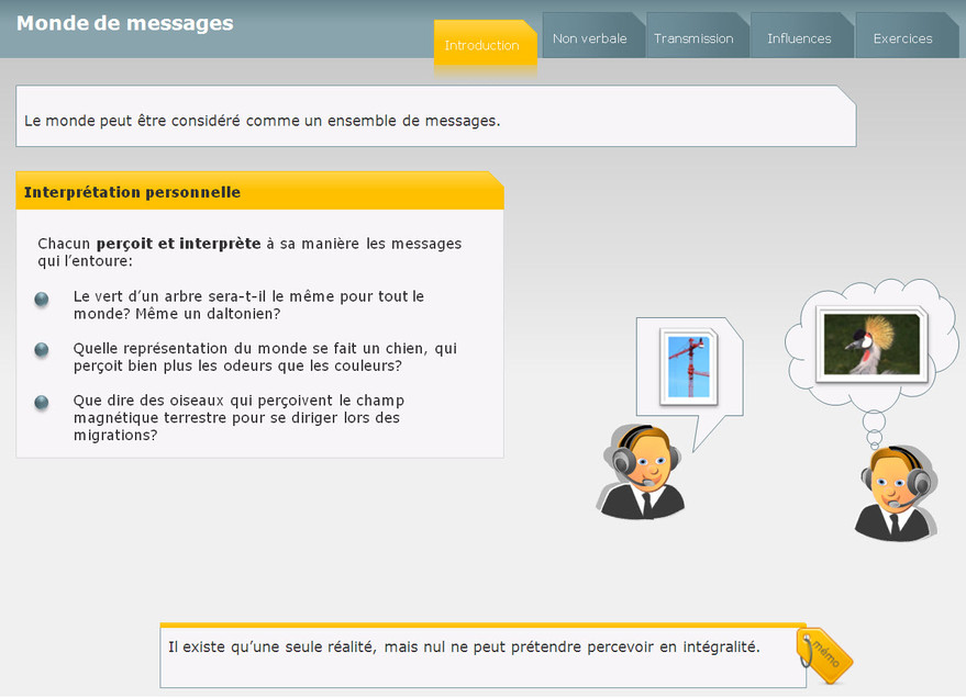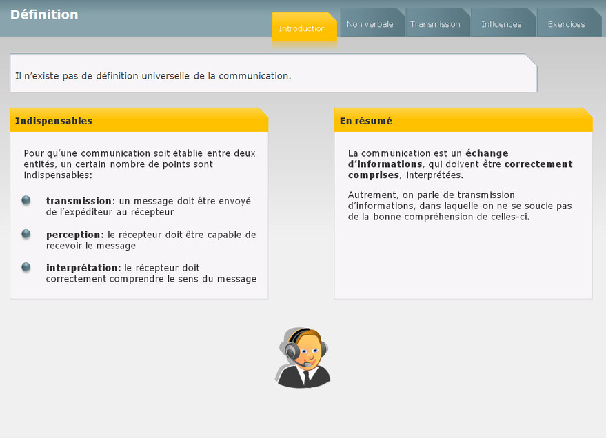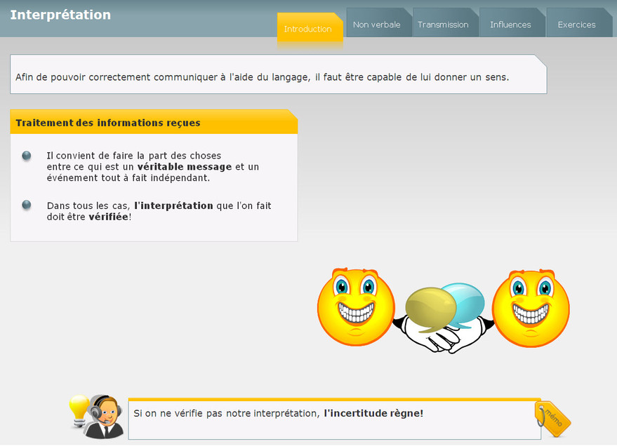 Ce module aborde les mécanismes de base de la communication, ainsi que les difficultés de compréhension et d’interprétation du langage. Il vise à éviter certains pièges courants de la communication.