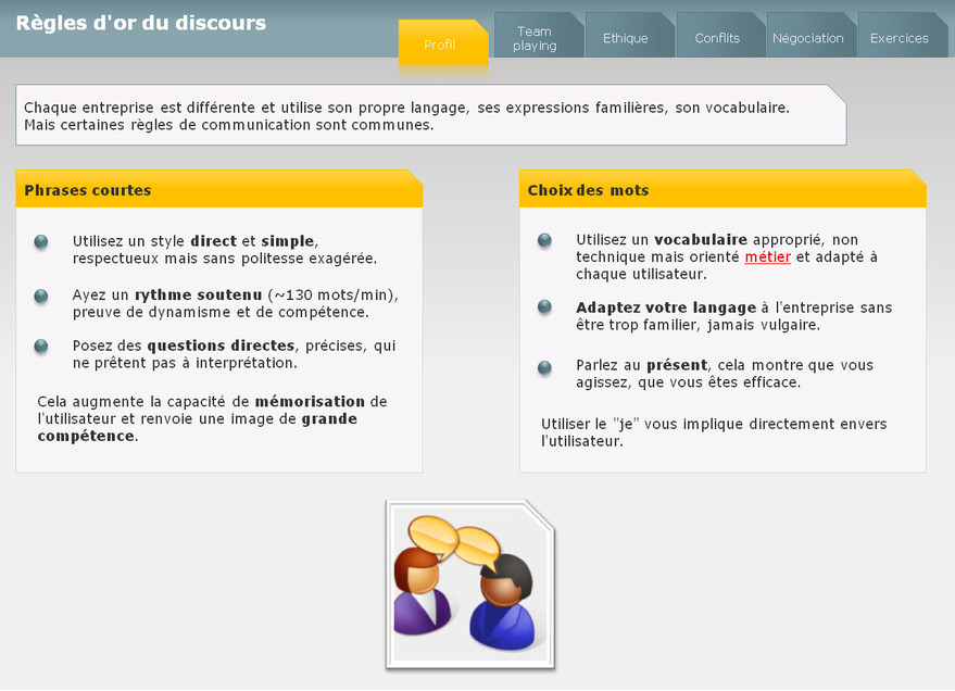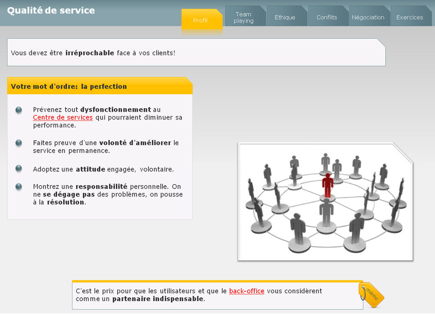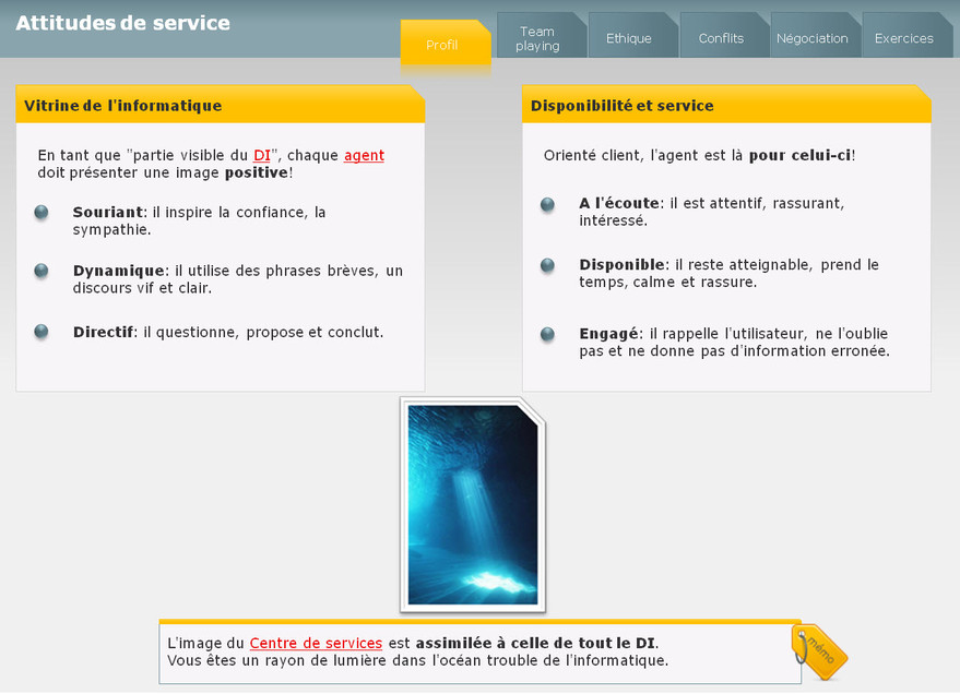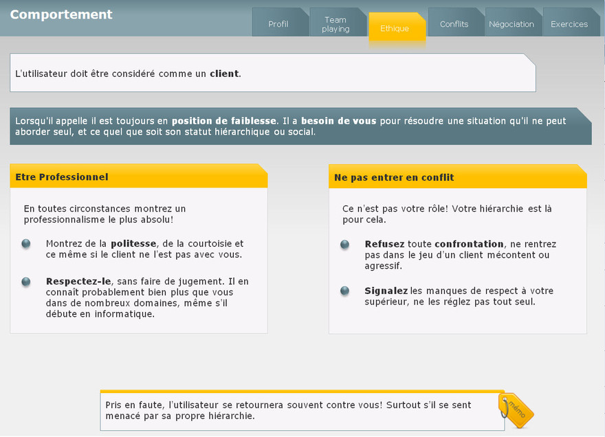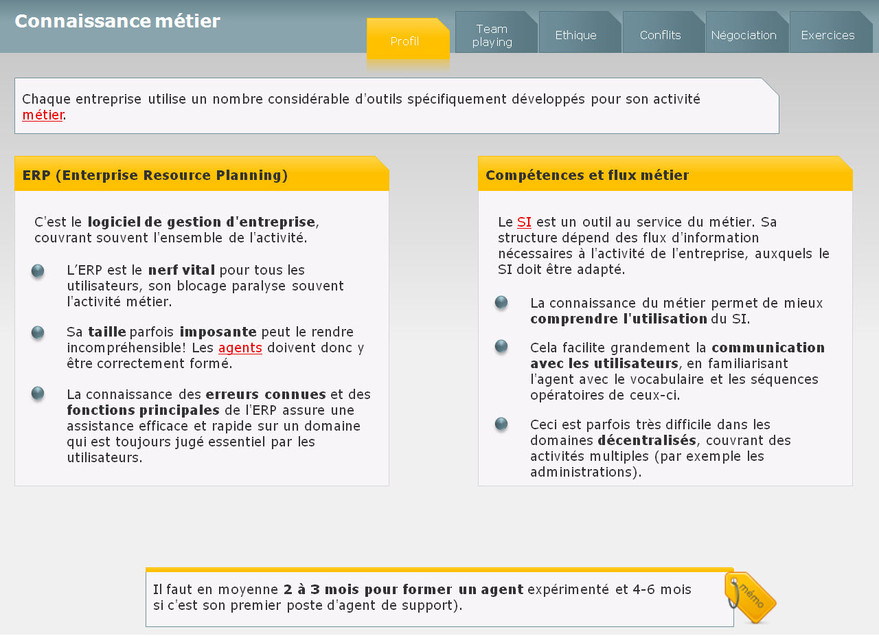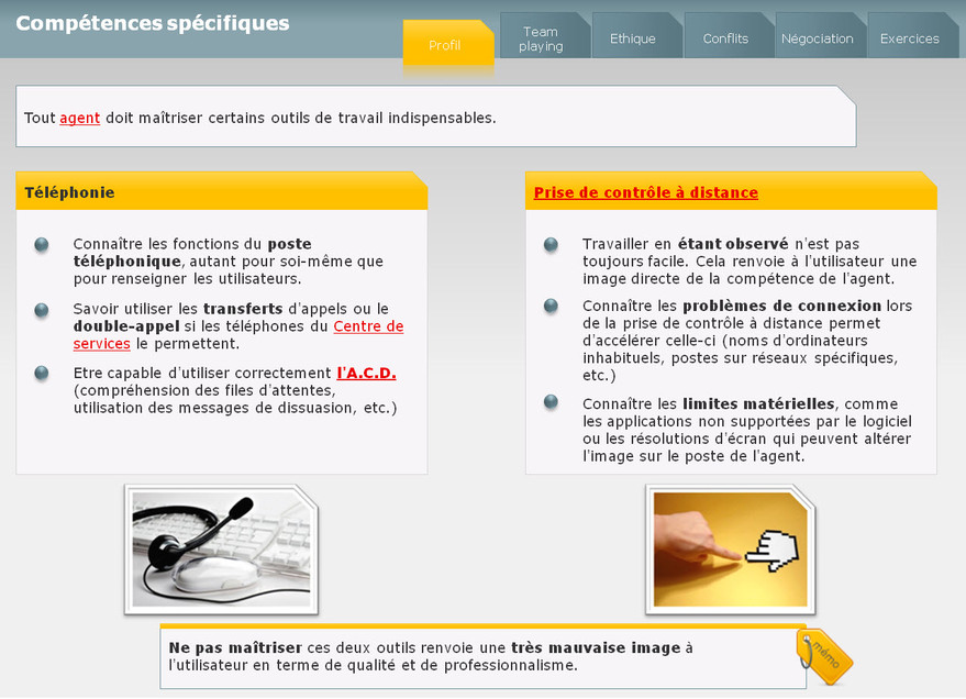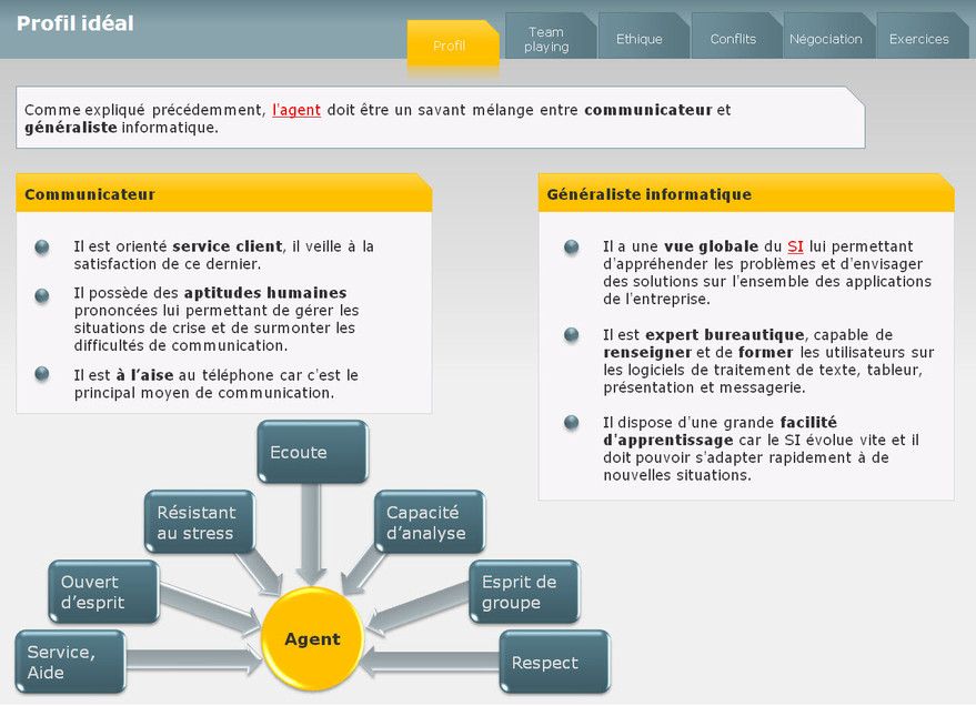 Ce module détaille le profil de l’agent de support ainsi que les règles éthiques et les valeurs propres au Centre de services. Il aborde également la gestion de conflits et la négociation avec les partenaires.