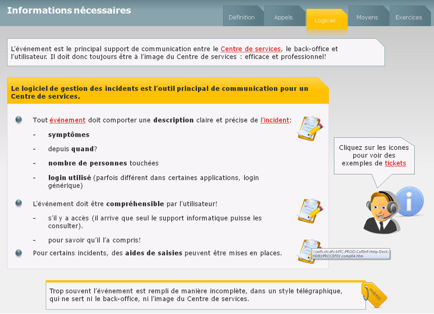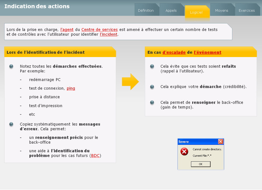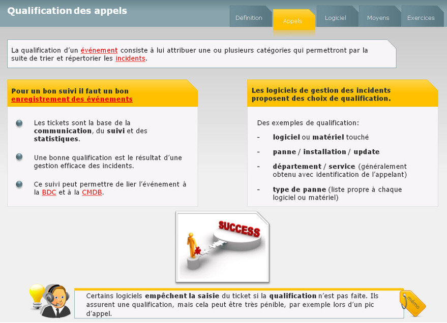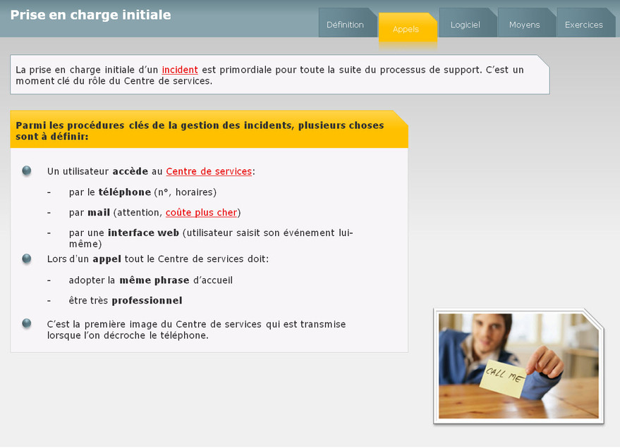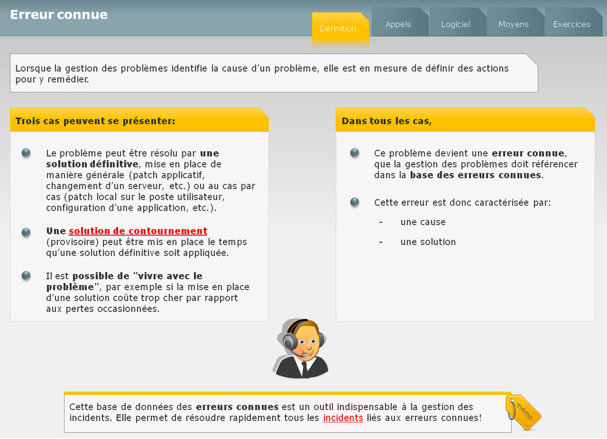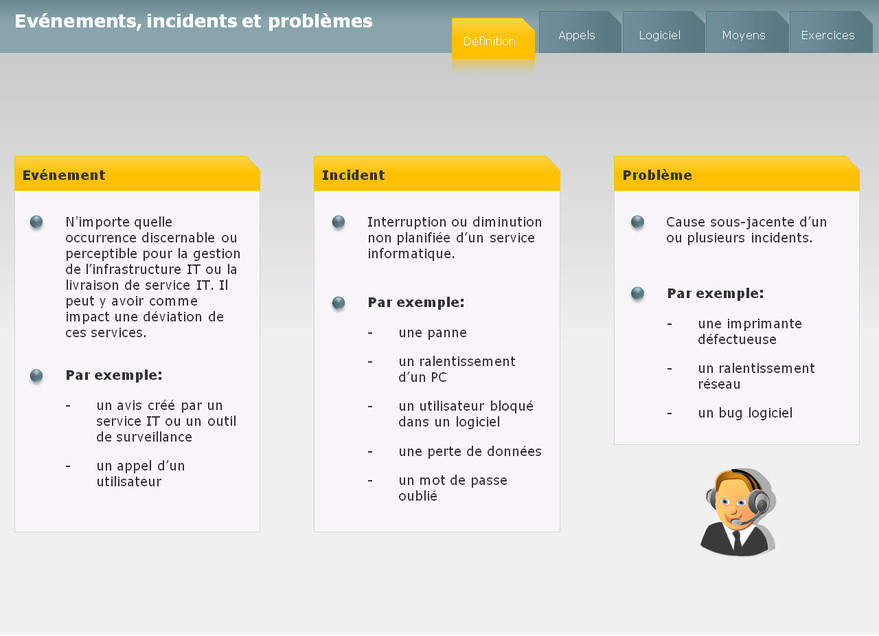 Ce module permet de faire la différence entre la gestion des incidents et la gestion des problèmes. Les points clés sont la prise en charge des événements et des incidents.